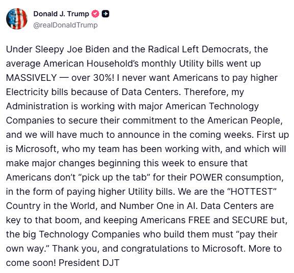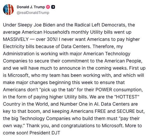 Overnight, Trump's staff appears to have read our post again, and in a late night post on Truth Social, the president - addressing American voter concerns about rising electricity prices - said his administration had been in talks with one of the largest energy hogs, Microsoft, to ensure that consumers “don’t pick up the tab” for enormous data centers.