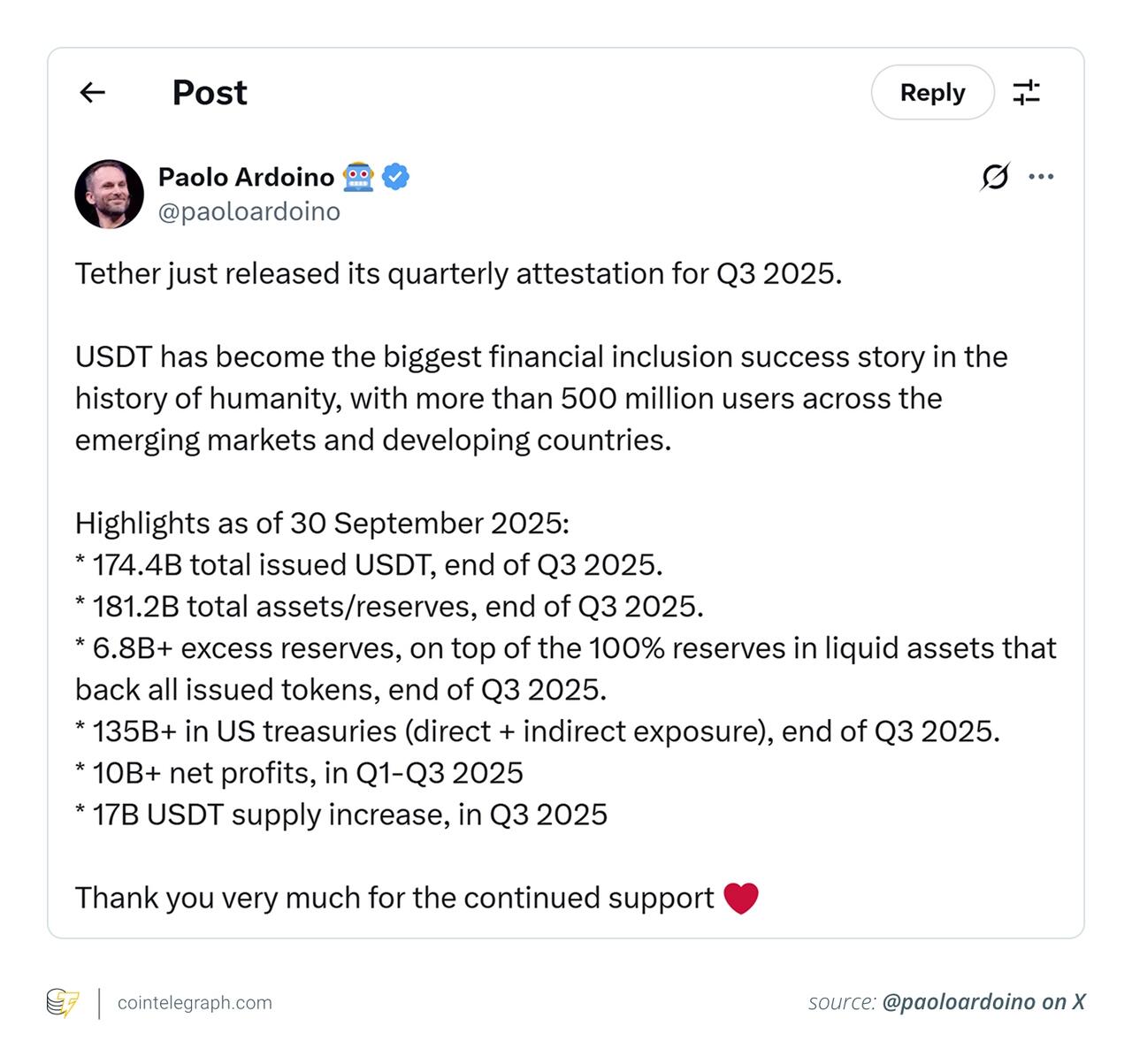 Its latest attestation shows $181.2 billion in reserves against $174.5 billion in liabilities, leaving $6.8 billion in excess and more than $174 billion in USDt in circulation. With interest rates high, that Treasury-heavy portfolio has generated over $10 billion in profit so far in 2025, a figure more typical of a financial institution than a crypto startup.